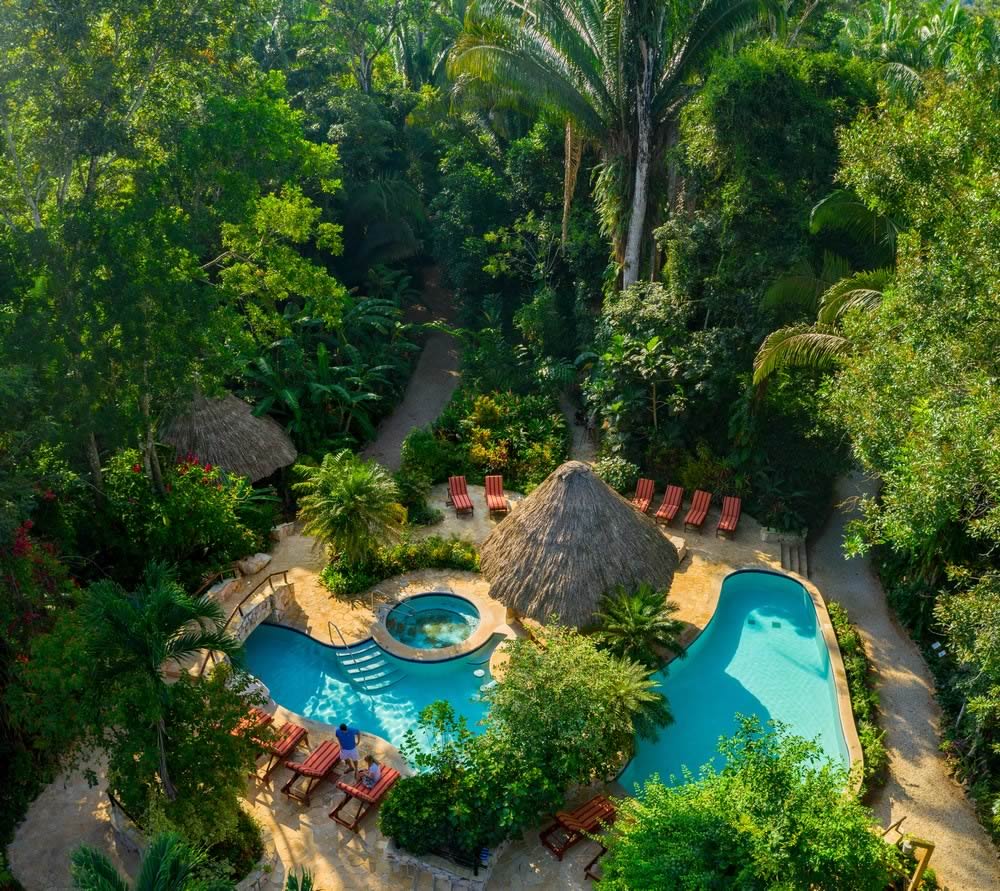 Caves Branch Jungle Lodge is located on the Caves Branch Estate in the heart of the Belizean jungle, overlooking the pristine turquoise waters of the Caves Branch River and nestled below a 100-foot rainforest canopy. The facility was designed to be a part of the jungle and wildlife that surrounds it.